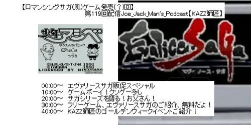 KAZZ師匠回/エヴァリースサガ/販促/お父さんには別の家庭が!/サガ3は名作/少年アシベ/KAZZし 00:00~ エヴァリースサガ販促スペシャル 10:00~ ゲームボーイ!クソゲー多し 20:00~ サガシリーズを語る!お父さん! 30:00~ フリーゲーム、エヴァリースサガ…